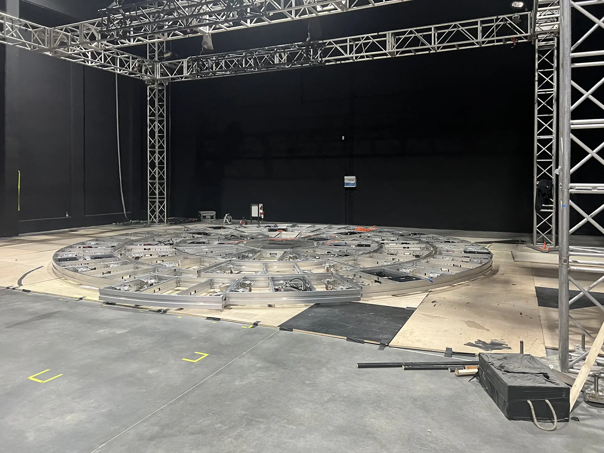 Este espacio cuenta con una altura libre de aproximadamente 10 metros, lo que permite el trabajo con disciplinas aéreas y estructuras escénicas.