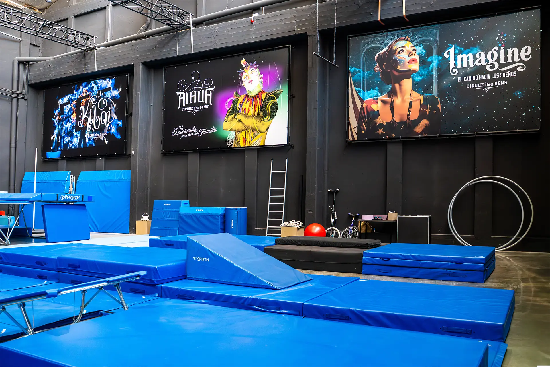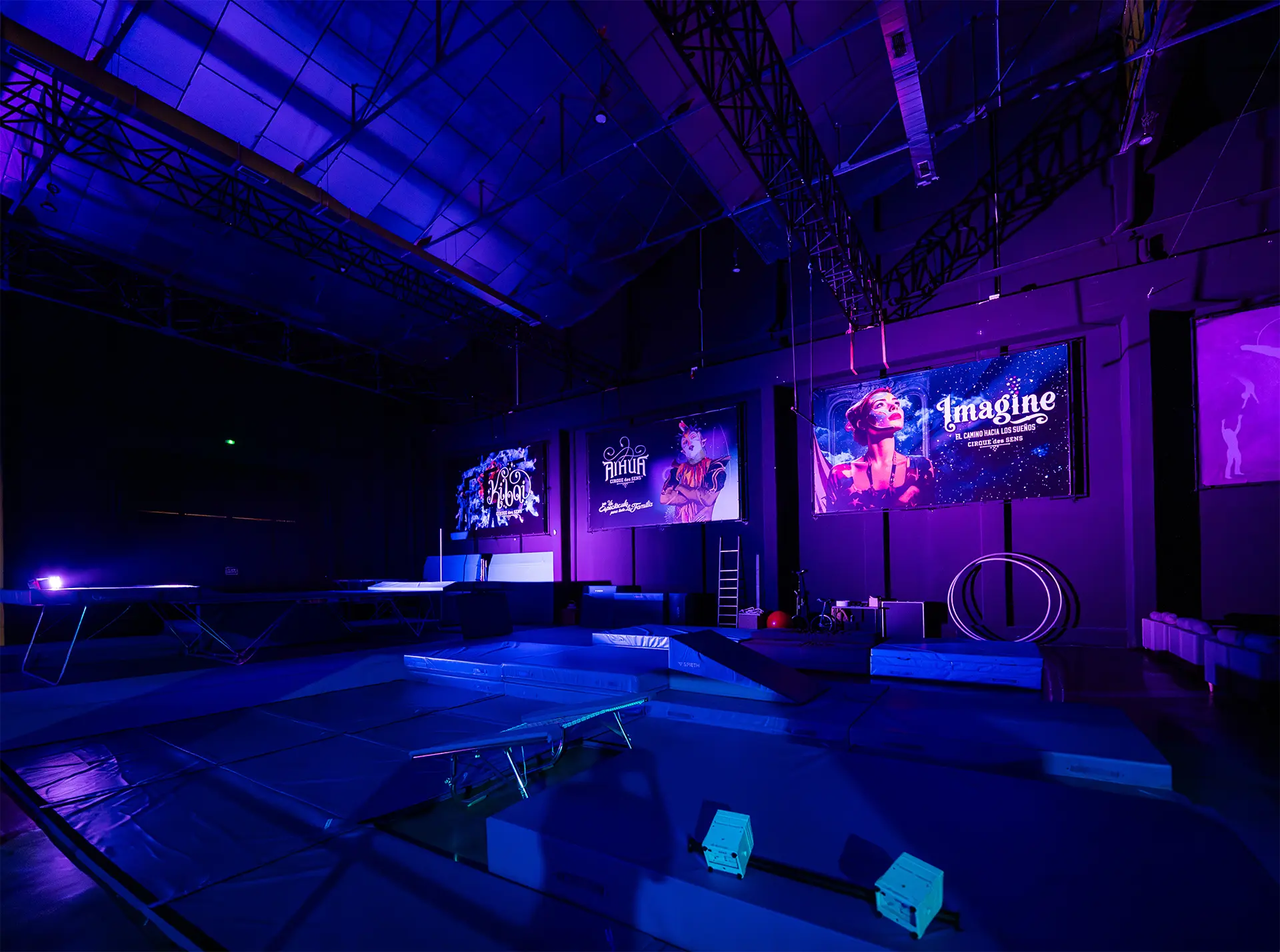 El espacio está diseñado para entrenamiento profesional, ensayos técnicos y residencias de compañías circenses, permitiendo trabajar tanto en disciplinas aéreas como en acrobacia de suelo.
